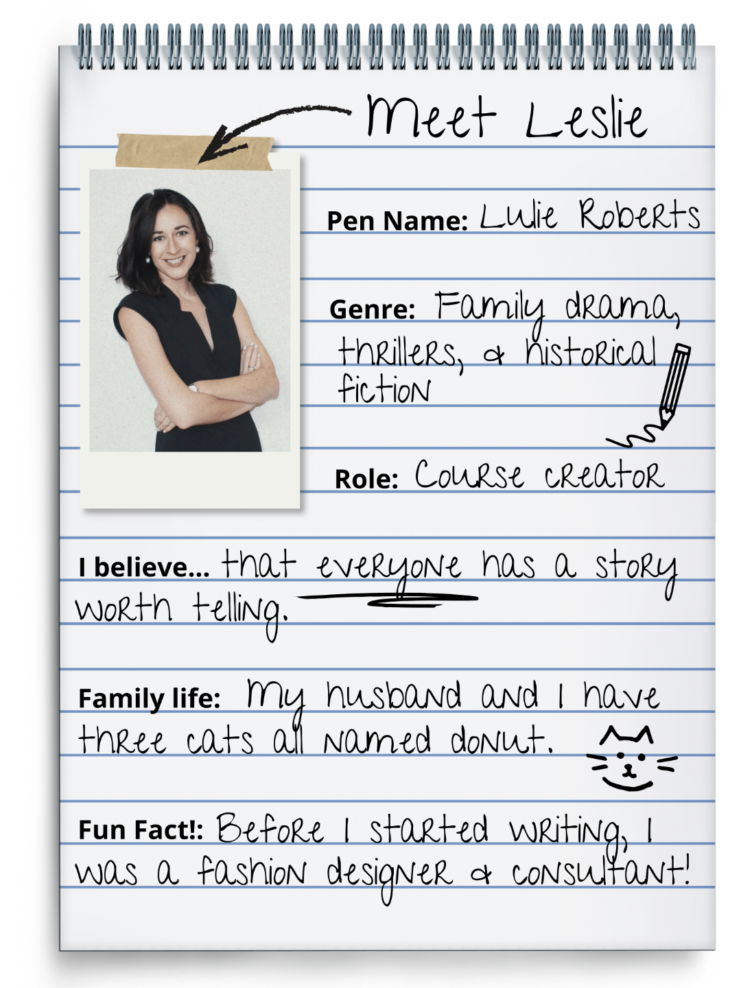 Leslie Friedman is the creator and instructor for Idea to Ink. She’s an instructional designer, bestselling author (under her pen name, Lulie Roberts), and a strategist who helps aspiring authors turn their ideas into finished books.
